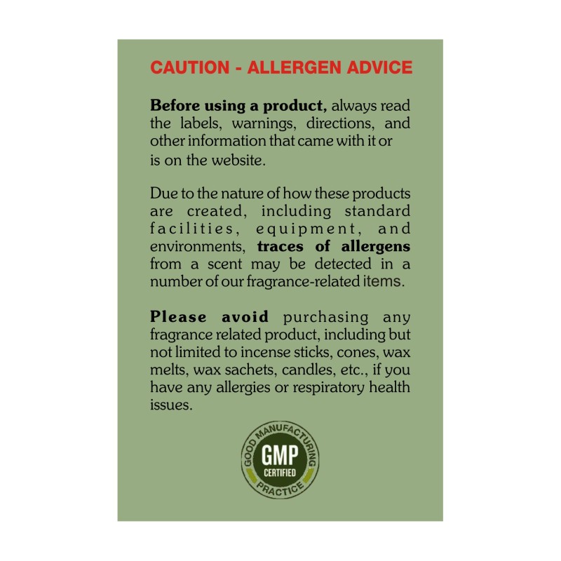 | Caution | Warning for oil: Oil is strictly not for body application and should not be ingested inflammable. Keep out of reach of children and pets. Avoid contact with eyes and skin. Spills should be cleaned up immediately to prevent staining. Store in a cool and dry place. Please check the packaging for allergen advise. Warning for oil burner: Keep clear of the Burner and do not touch it while the candle is still burning. Make sure that anything flammable is at least 3 feet away from your oil burner. |