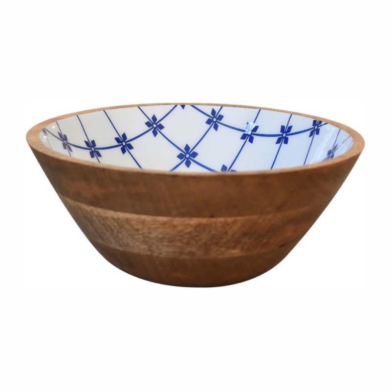 Beautifully crafted from solid Mango Wood, this beautiful bowl set is bound to wow your guests. With natural Mango Wood grain detailing externally and internal lacquered blue and white flower patternings, the style and contrast of the design and wood finish really allow the natural beauty of materials to shine.This product is handcrafted individually and as every piece is unique please do expect variations in finish, texture, size and should not be considered as a defect.