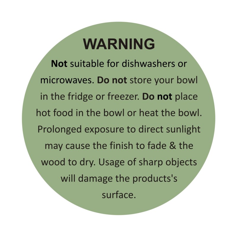 | Caution | WARNING : Not suitable for dishwashers or microwaves. Do not store your bowl in the fridge or freezer. Do not place hot food in the bowl or heat the bowl. Prolonged exposure to direct sunlight may cause the finish to fade & the wood to dry. Usage of sharp objects will damage the products's surface. |