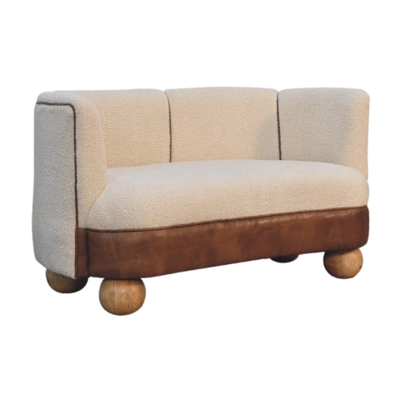 Derived from the French word for 'curled' or 'ringed' yarn or fabric. This handwoven upholstered sofa is made of 100% cotton and natural yarn, combining a buffalo hide leather seat and round ball feet constructed from 100% solid mango wood in a ak-ish finish for added contrast.