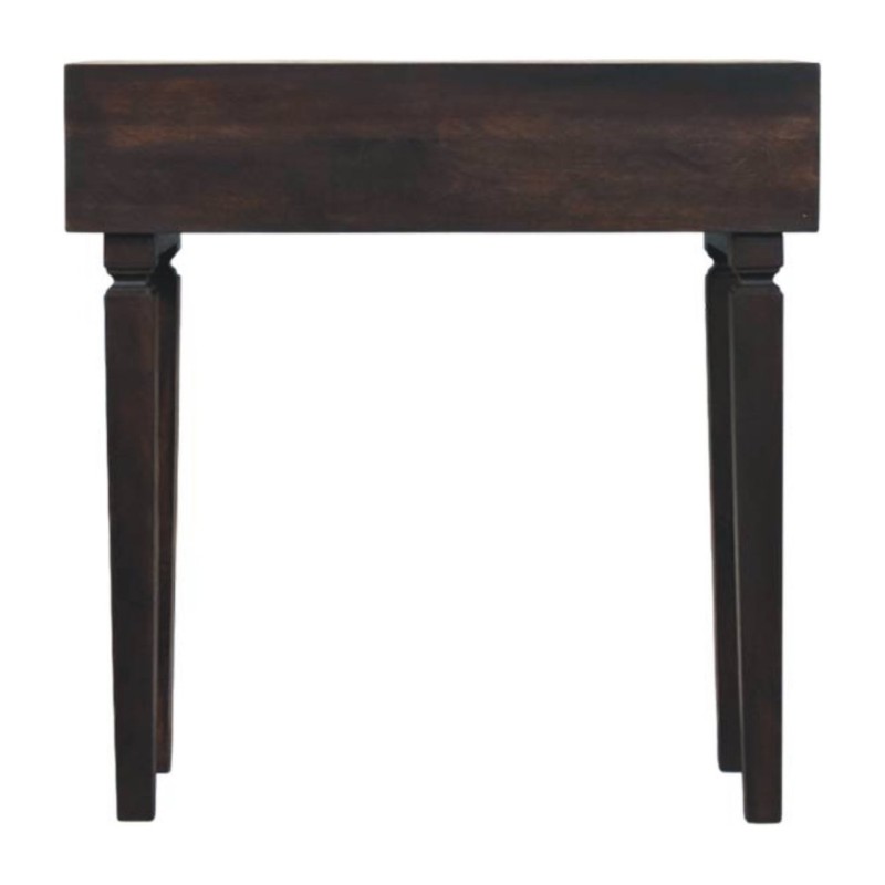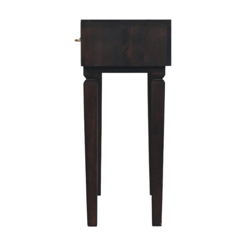 | The Cadiz Carved Slim Console is a refined statement piece that blends artisanal detail with a clean, architectural silhouette. Handcrafted from 100% solid mango wood, this console features a beautifully carved drawer front that adds depth and texture without overwhelming the design. Finished in a rich Velvet Mocha tone, the wood’s natural grain is subtly enhanced, creating a warm and sophisticated presence. Elevated on slender, tapered legs, the slim profile makes it ideal for hallways, entryways, or behind a sofa, offering functional storage while maintaining an elegant, uncluttered aesthetic. Part of the Cadiz Carved collection, this console brings craftsmanship and contemporary balance into any space. |