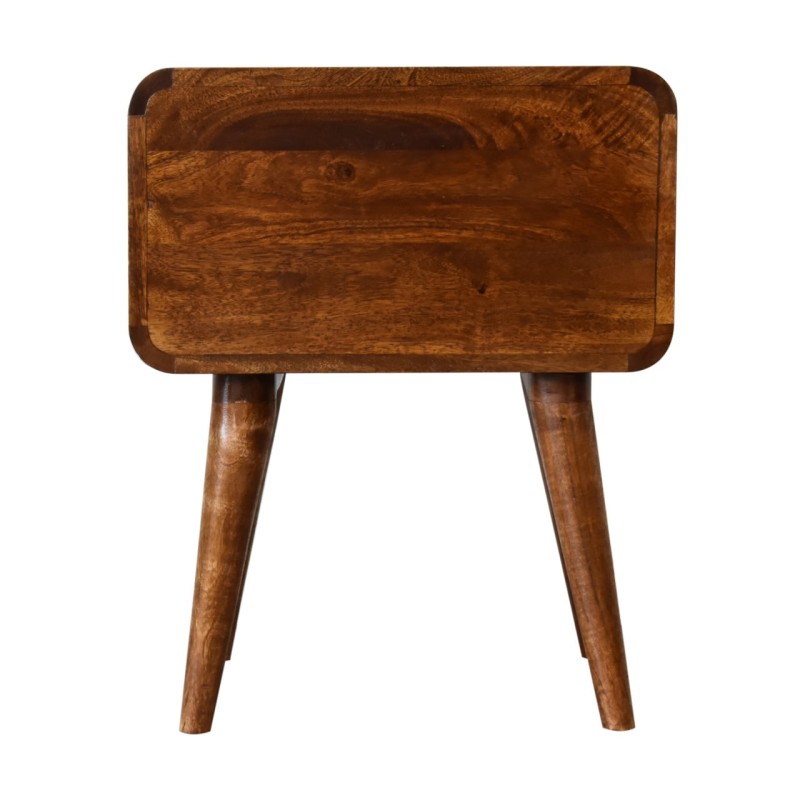 Endlessly versatile, this curved bedside table makes a perfect stand for nibbles, drinks, or a lamp. It will prove handy all over your home and is made from 100% solid mango wood and has a fine chestnut finish. It has curved edges which will fit into any home/living space. It also comes with 2 drawers that come with shiny knobs and 4 Nordic style legs.