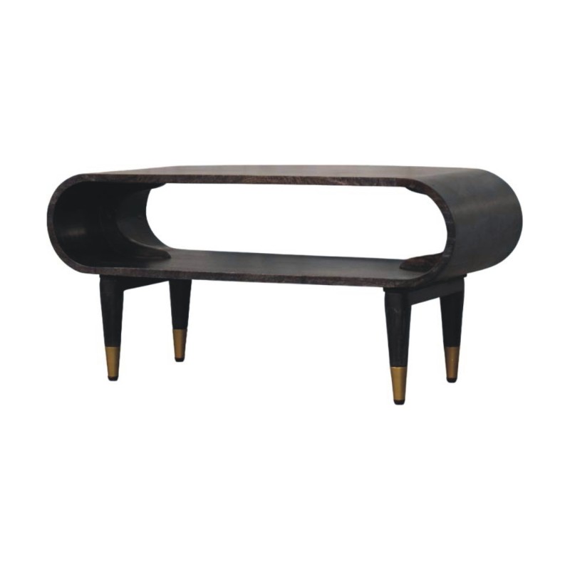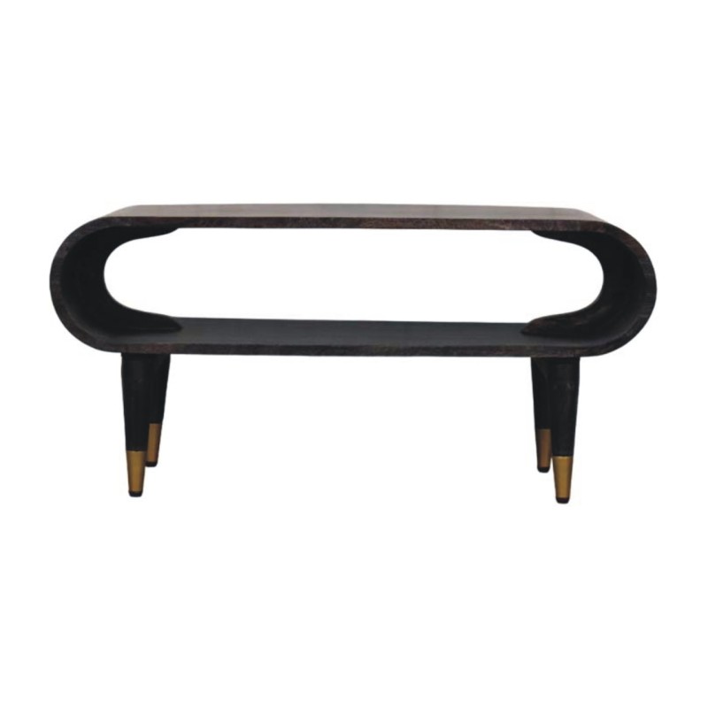 Elevate your interiors with this show-stopping Velvet Mocha Media Unit, defined by its fluid, continuous curve design. Crafted from 100% solid mango wood in a rich, hand-applied Carbon Ash finish, it blends organic form with timeless style. The twin-shelf structure adds versatility, while the gently tapered legs, tipped with polished brass, bring a luxe contrast. Whether styled in an entryway or behind a sofa, this piece offers both elegance and function in equal measure.