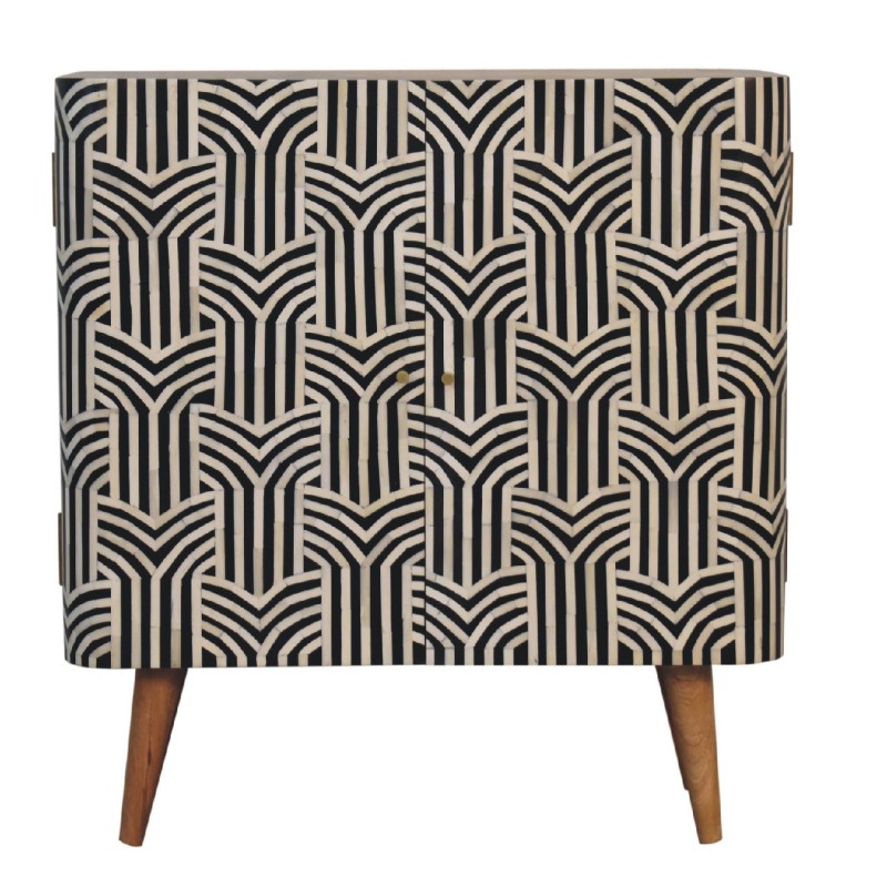 This beautiful boho inspired cabinet has been constructed from 100% solid mango wood and has a fine oak-ish finish. Other features include bone inlay front doors, and Nordic style legs. The bone inlay is sourced responsibly from deceased animals such as camels, goats, and buffaloes.