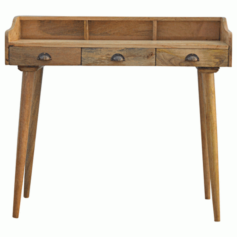 This writing desk is constructed from 100% solid mango wood and has a fine oak-ish finish. Useful storage space is available for paper, and small bits and bobs with its 3 drawers and a gallery back which has 3 slots. Other features include 4 Scandinavian styled legs, and a decent sized table top to work on.