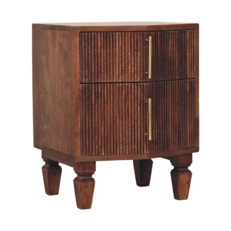Introducing the Harper Nightstand, a bold statement in sculpted woodwork and timeless elegance. Crafted from 100% solid mango wood and finished in a rich Amber Oak tone, this bedside table features two vertically grooved drawers with elongated brass handles, offering both texture and utility. Its raised carved legs lend it a classic foundation, while the curved front adds a refined, modern twist. Perfect for framing your bedside or enhancing a quiet reading nook, the Harper Nightstand is a perfect blend of artistry and function.