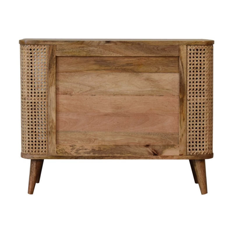 The Larissa open cabinet will stand out in your interior thanks to its understated look and subtle originality. The beautiful grain pattern and rattan design do not make this cabinet any less functional. In fact, it has 4 small shelves and ample space on top for displaying any ornaments, flowers, or candles. It has been constructed from 100% solid mango wood in an oak-ish finish and features nordic style legs.