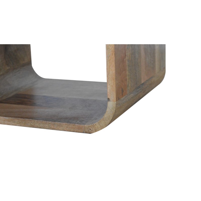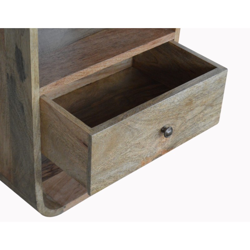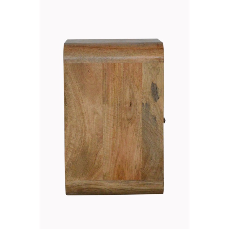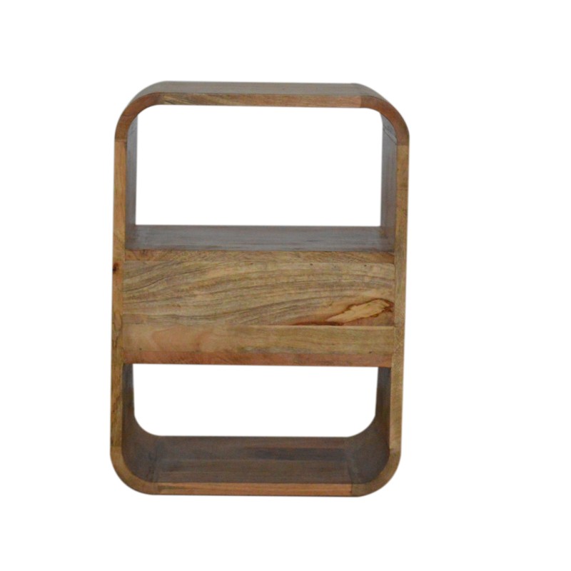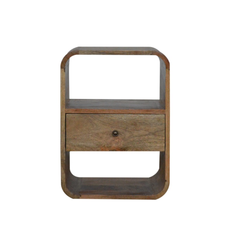 This solid wood bedside has been constructed from 100% solid mango wood in an oak-ish finish and offers a nice rounded look on the edges. It features 1 drawer which comes with a shiny brass knob and 2 open slots for extra storage. A great simple and addition to the bedroom.