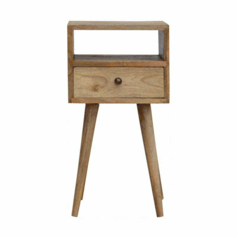 This beautifully designed bedside is constructed from 100% solid mango wood with a fine oak-ish finish. It features 1 small drawer giving the piece extra character and dimension. It has 4 Scandinavian style legs to modernize your home, and can be fitted in tight compact space to go in any type of home interior.