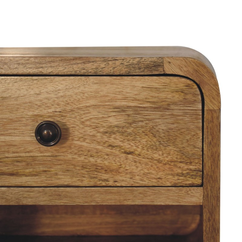 Inspired by our curved range, this minimalistic mini wall-mounted unit has been constructed from 100% solid mango wood in a oak-ish finish and features 1 drawer and 1 open slot. This piece is perfect for storing any bits and pieces you wish to keep close by before bedtime. Its neat and clean design can easily be mounted on the wall without the fuss of any legs. Caution! Do not sit on the unit. This petite product is part of Recession Collection.