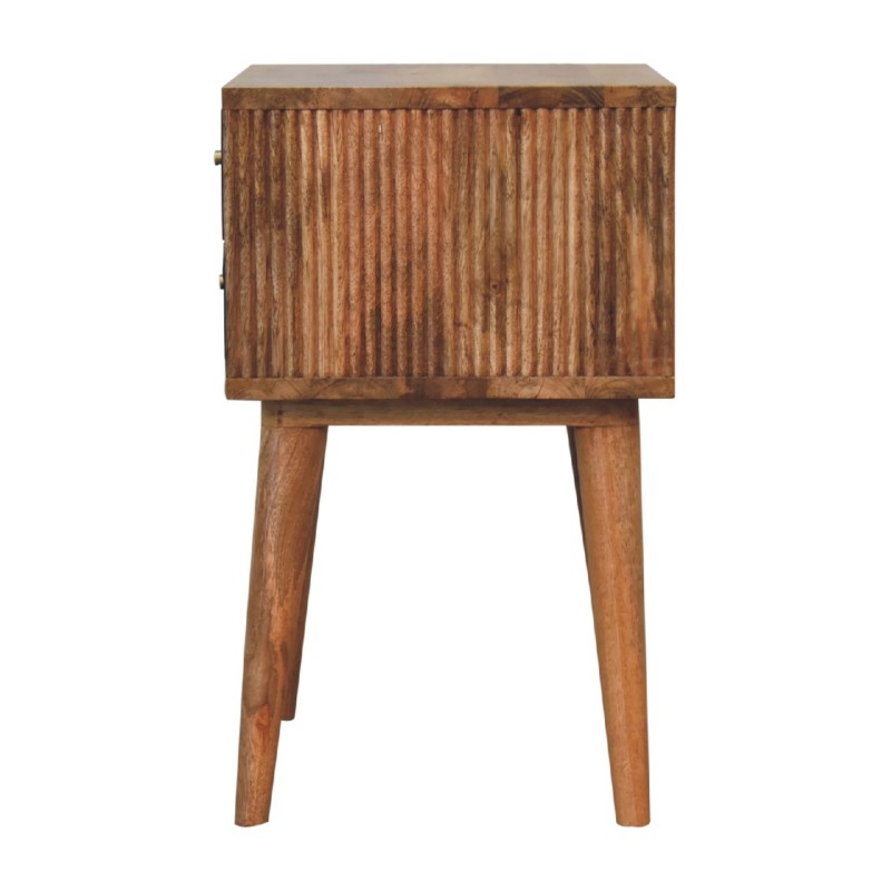 This bedside has been constructed from 100% solid mango wood in a fine oak-ish finish. The beautiful slate drawers are definitely prominent in this piece and provide a lovely contrast with the finish of the wood. Other features include nordic style legs and shiny bass knobs.